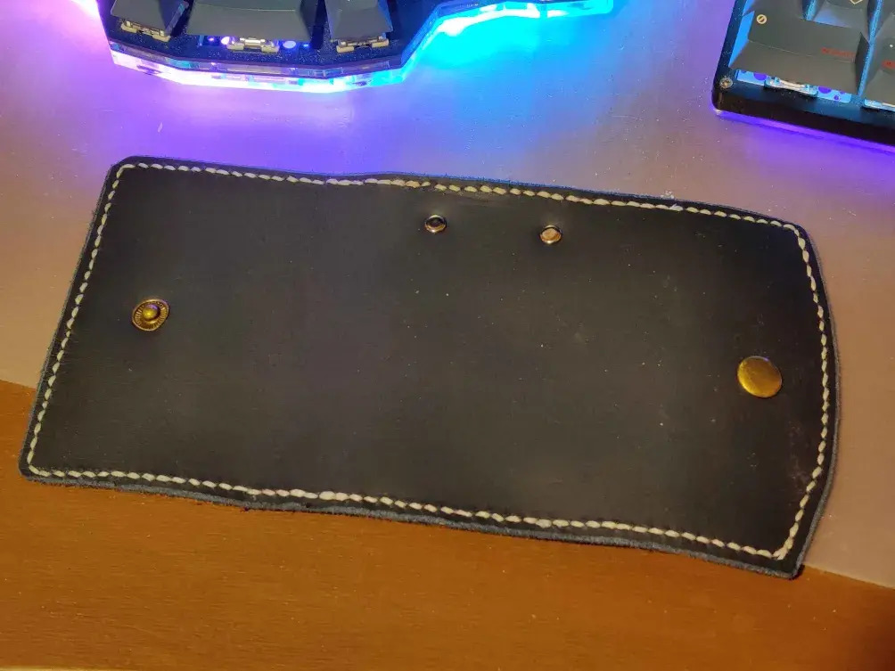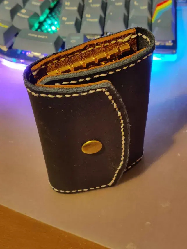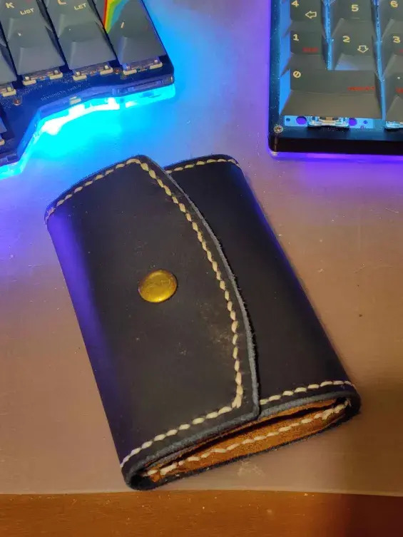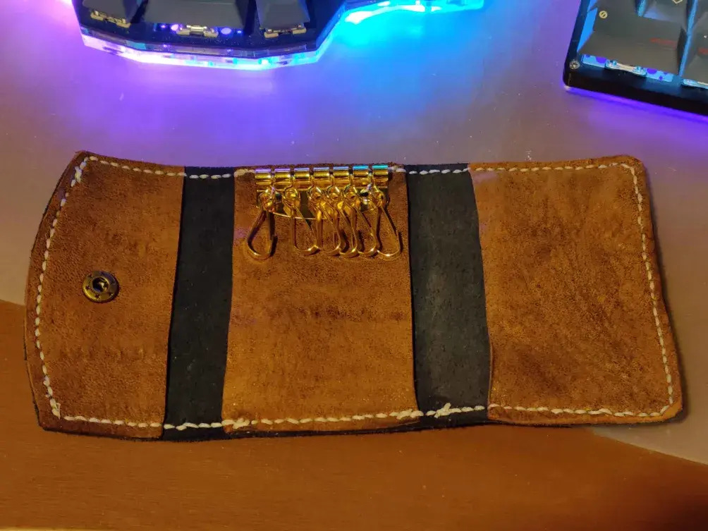 I was given a bag of leather offcuts by a friend which was great to get to grips with the various tools. The starter kit included a key wallet thingy. Whilst I’m not a fan of these kind of key rings, it was a good starter project. Templates are easy to find online, and over a few evenings, I put the key wallet above together. It is far from perfect. Mistakes were made. Things could and should be done better. But a lot was learned. And I was very happy for the results from my first leather project.